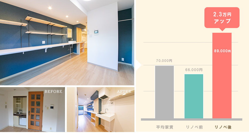 家賃アップのカギは、お客様が何を望んでいるのか?を知り、お客様に合わせたお部屋を提供する事です。壁紙や水道、棚を作る事でこれだけ雰囲気が変わるお部屋が作れます。
